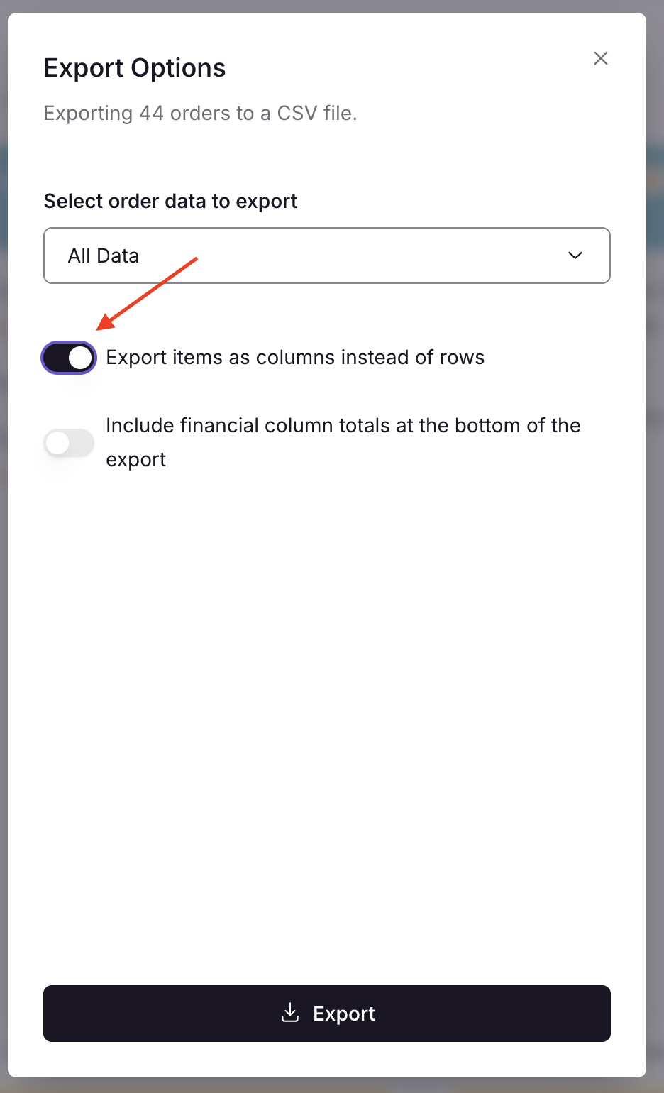 This will give you a spreadsheet with each item as a column and the rows as orders.