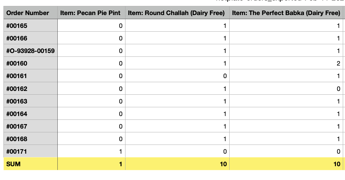 - To get a total sold for each item: open up the spreadsheet and add up each item column. You can do this very quickly by adding a row with the function SUM. Here’s a quick explainer on how to do this on Google Sheets (this is usually the same in Excel or Numbers).