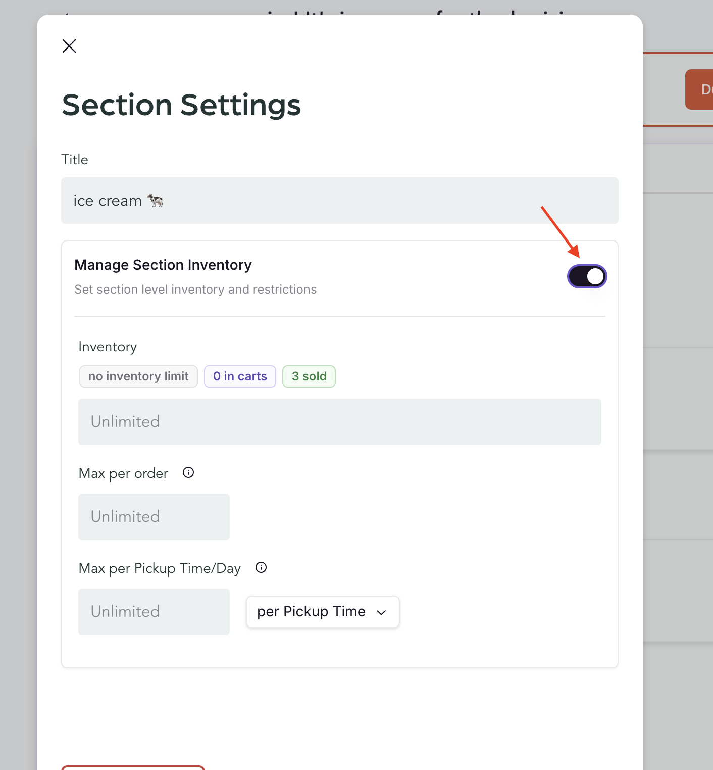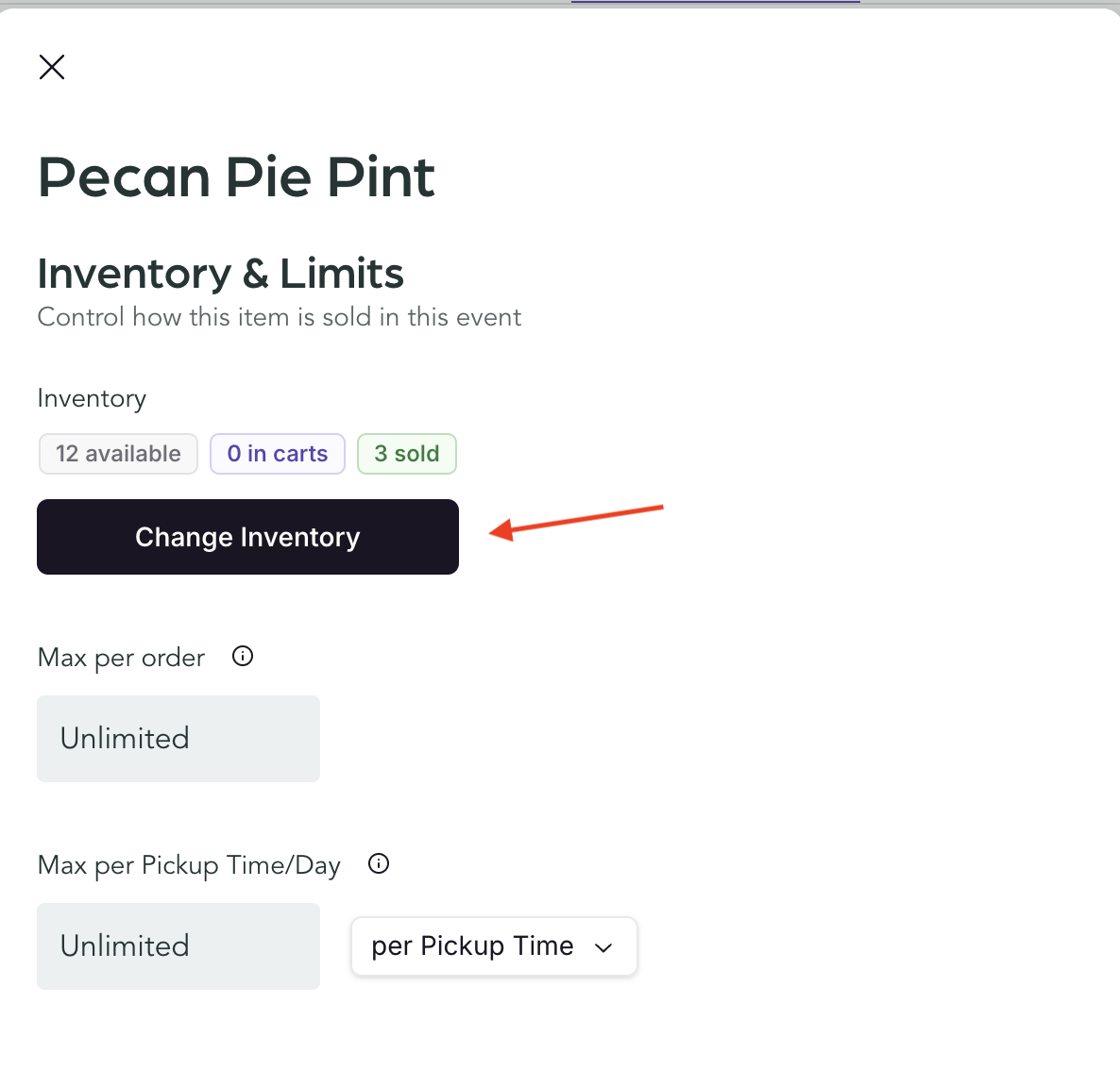For example, let’s say you’re selling pints of ice cream, and you set the inventory of the Chocolate Ice Cream Pint Item to 40. But then, you set the “Max per pickup date” to be 10. In that case, once 10 pints have been ordered for each pick up date, (even if 1 customer ordered all 10 pints), the item would appear as sold out.