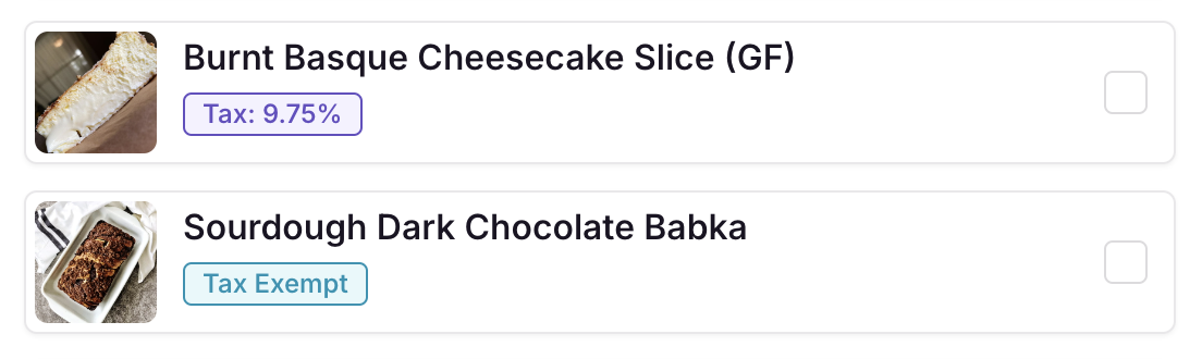 Similarly, items with custom tax rates (or set as tax exempt) will clearly display these custom settings in the menu item selection list: