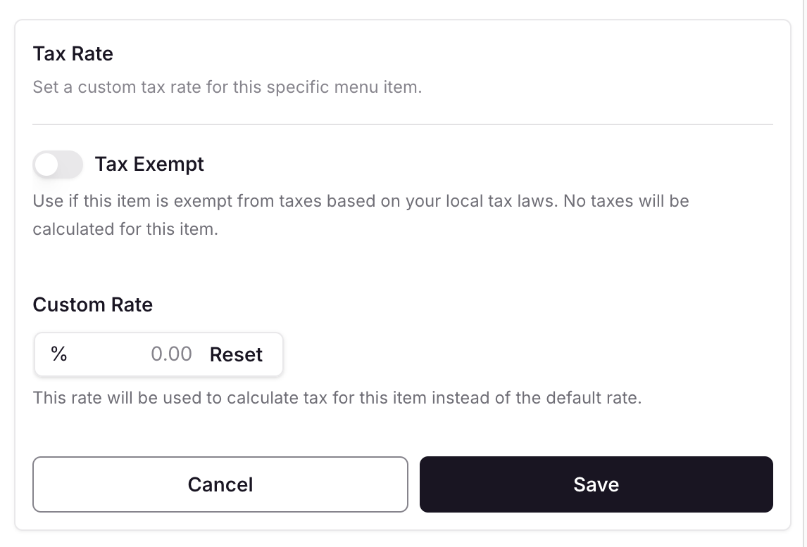Some items may be taxed differently under your local tax laws, so you can set up specific rates per menu item. If a menu item has a custom rate, it will be used at checkout to calculate taxes instead of any location or global tax rates.