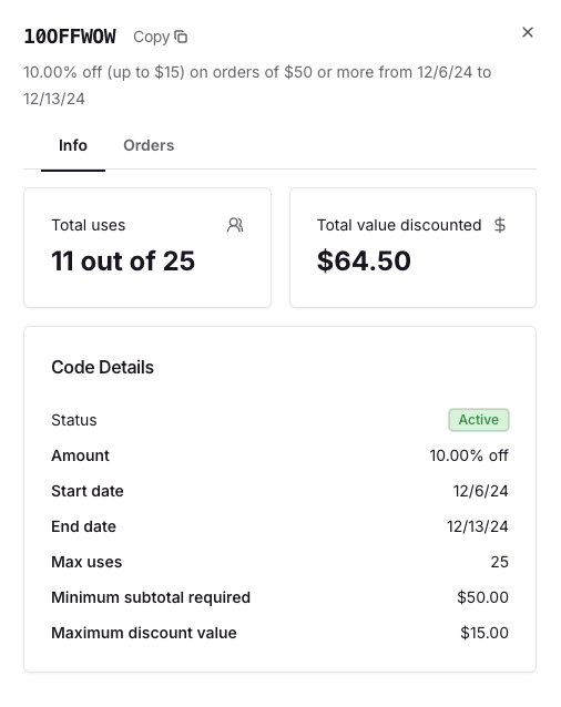 You can click on each code to see details on it’s settings and how much it’s been used. That info panel will look like this: