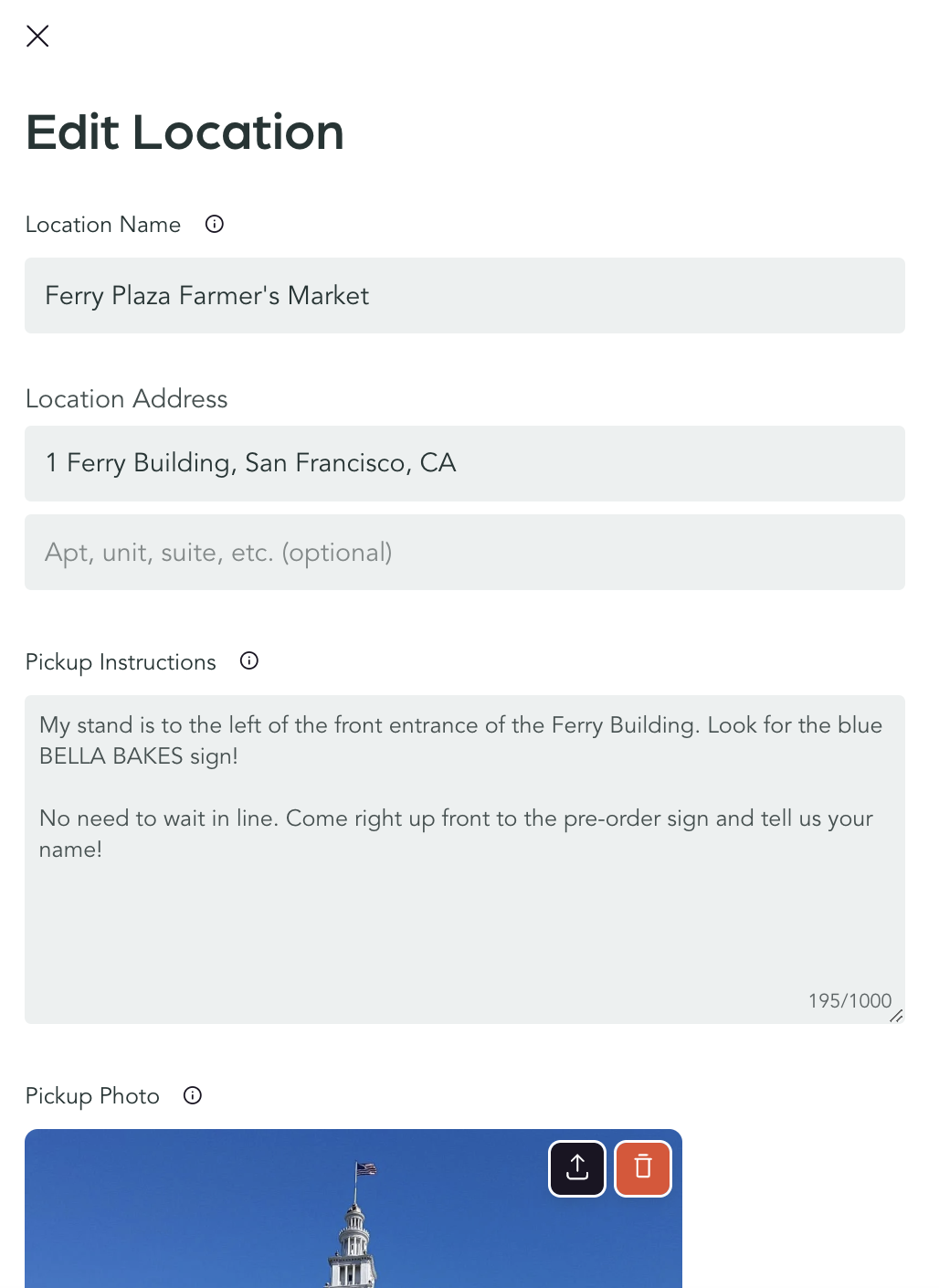 To ensure pickups go smoothly, you may want to include extra details so your customers know exactly where to go and what to look for when they show up. Do they need to wait in line, or can they jump up to the front? Is there a sign they should look for? Should they give their name when they arrive?