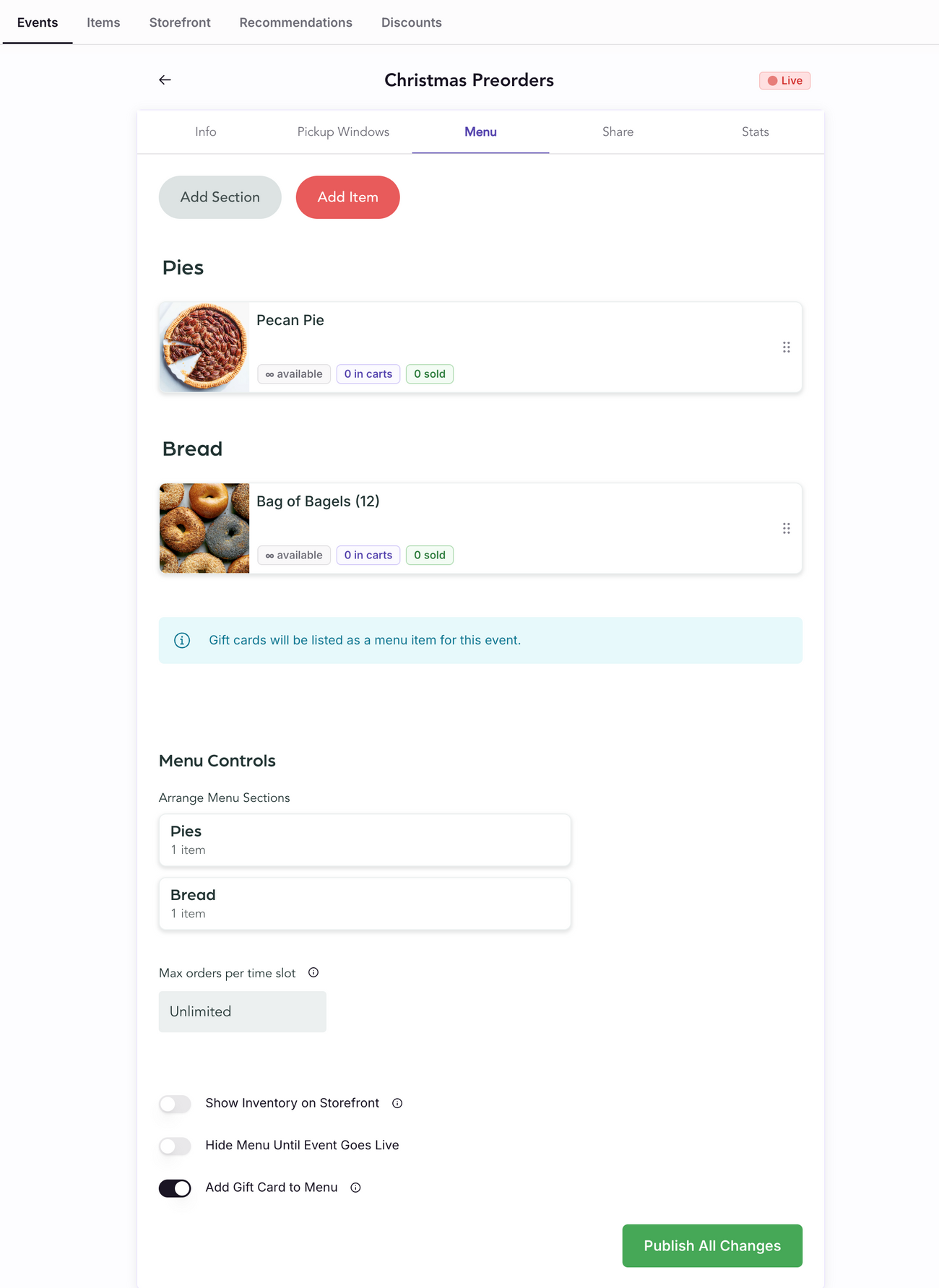 The menu tab of the event is where you manage your menu for a particular event. If you want to sell gift cards as a part of your event, you can do that here!