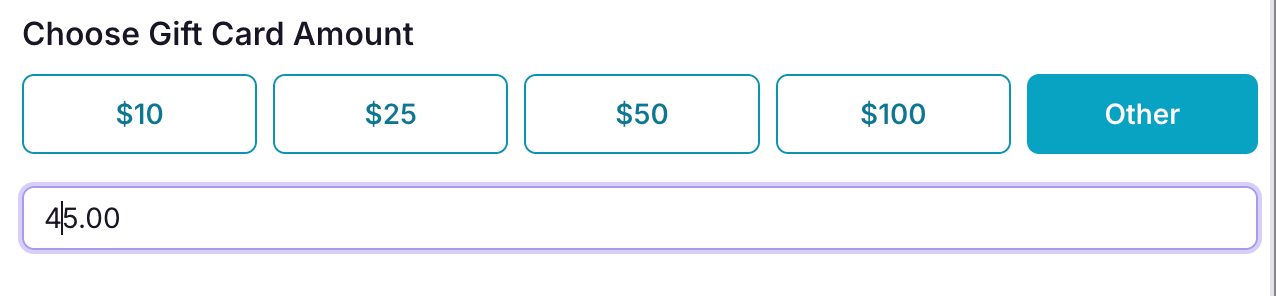 Customers can choose from presets of available gift card amounts, or can choose a custom amount:
