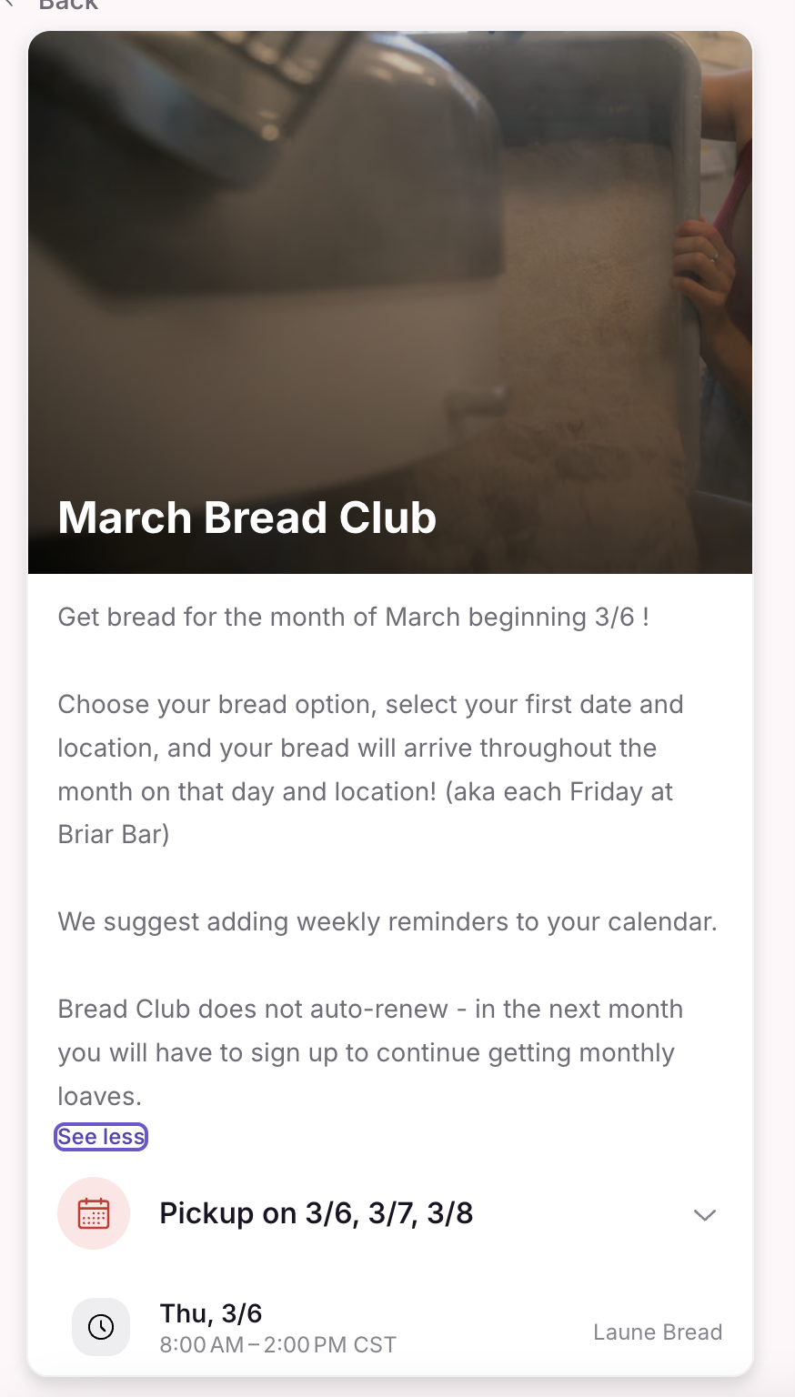 Lets customers pre-order bread for every week or every other week through their bread clubs. Check out their “ March Bread Club ”.