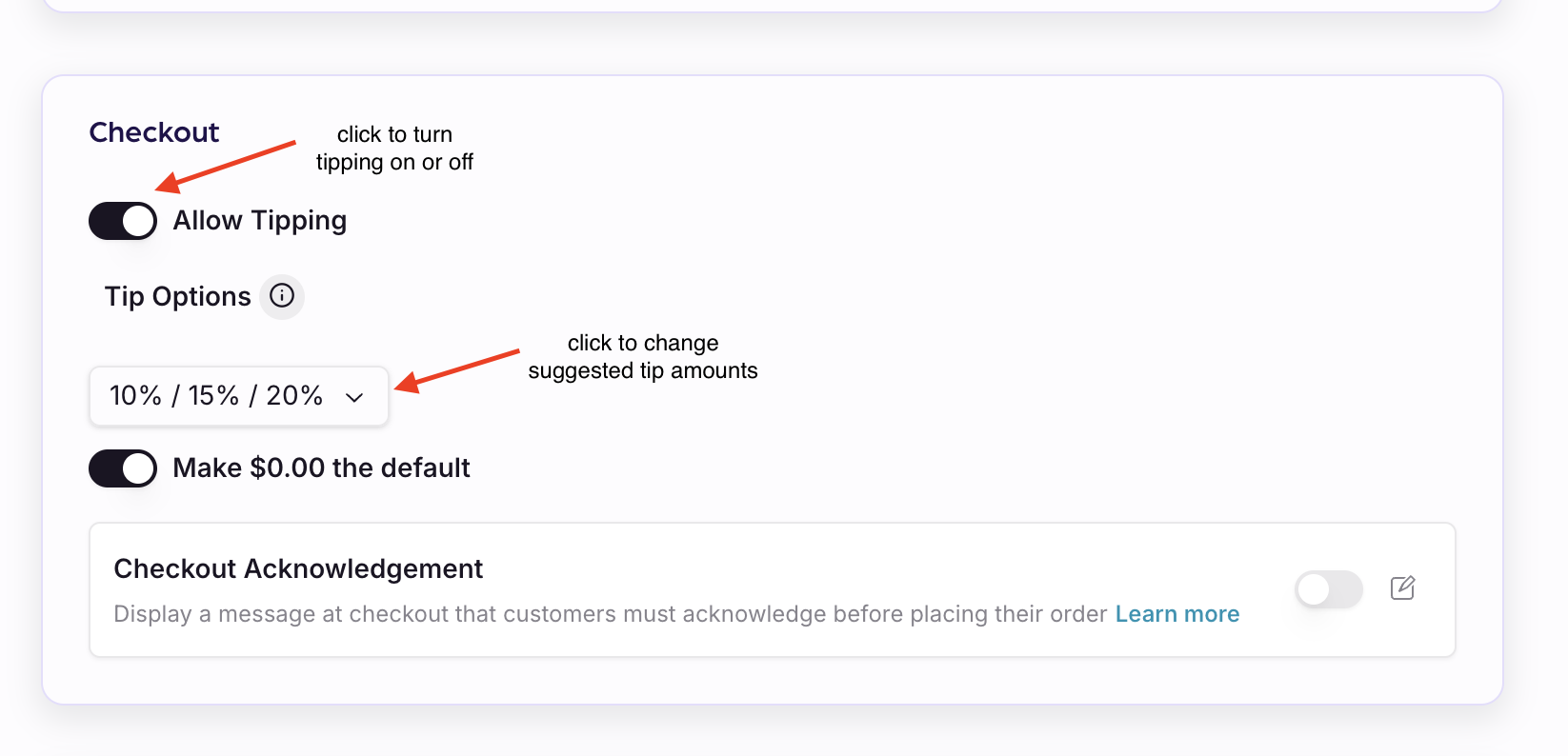 - Here, you can toggle Allow Tipping on or off, and select the suggested tip percentages
