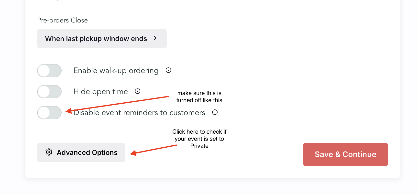 You can find this setting at the bottom of the Info tab when you create an event. Make sure this isn’t turned on.