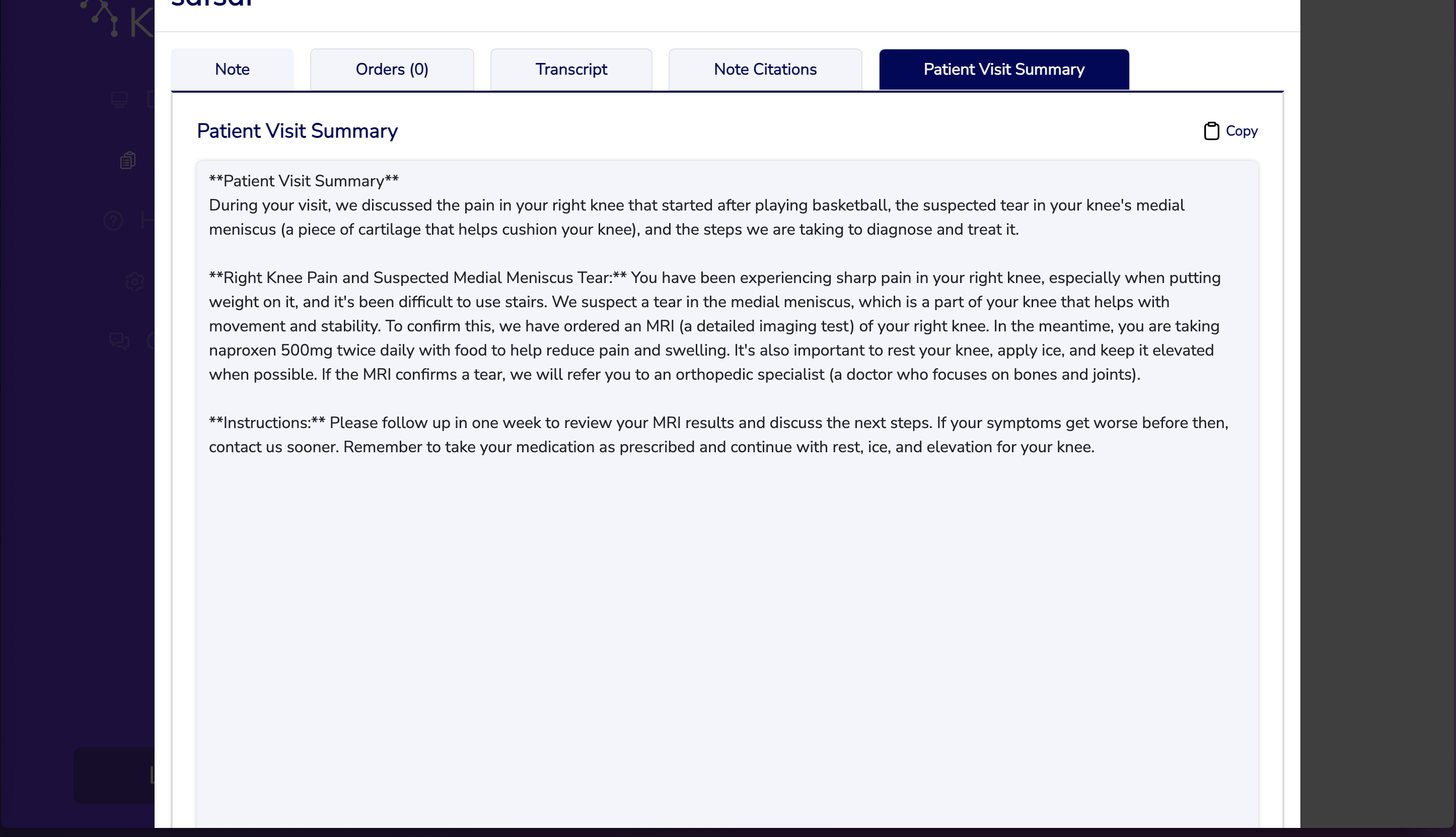 - Medical terminology with plain-language explanations (e.g., "medial meniscus (a piece of cartilage that helps cushion your knee)")